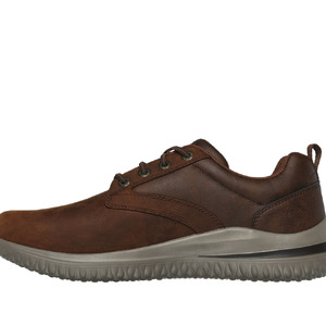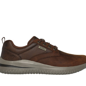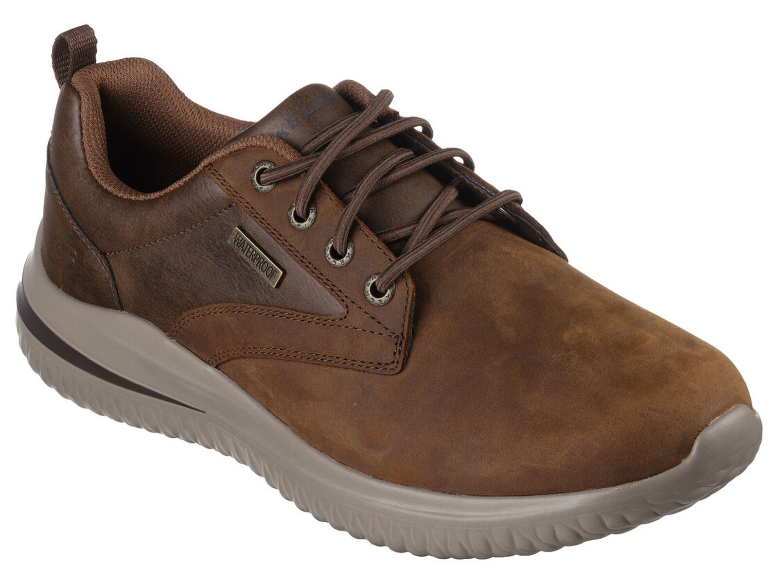 A favorite versatile style gets even more comfortable in the Skechers Delson 3.0 - Glavine. This Classic FitTrademark] waterproof style features a leather upper with stretch laces, a charcoal-infused Skechers Air-Cooled Memory Foam® insole, and Skechers Goga Mat Arch™ cushioning.
