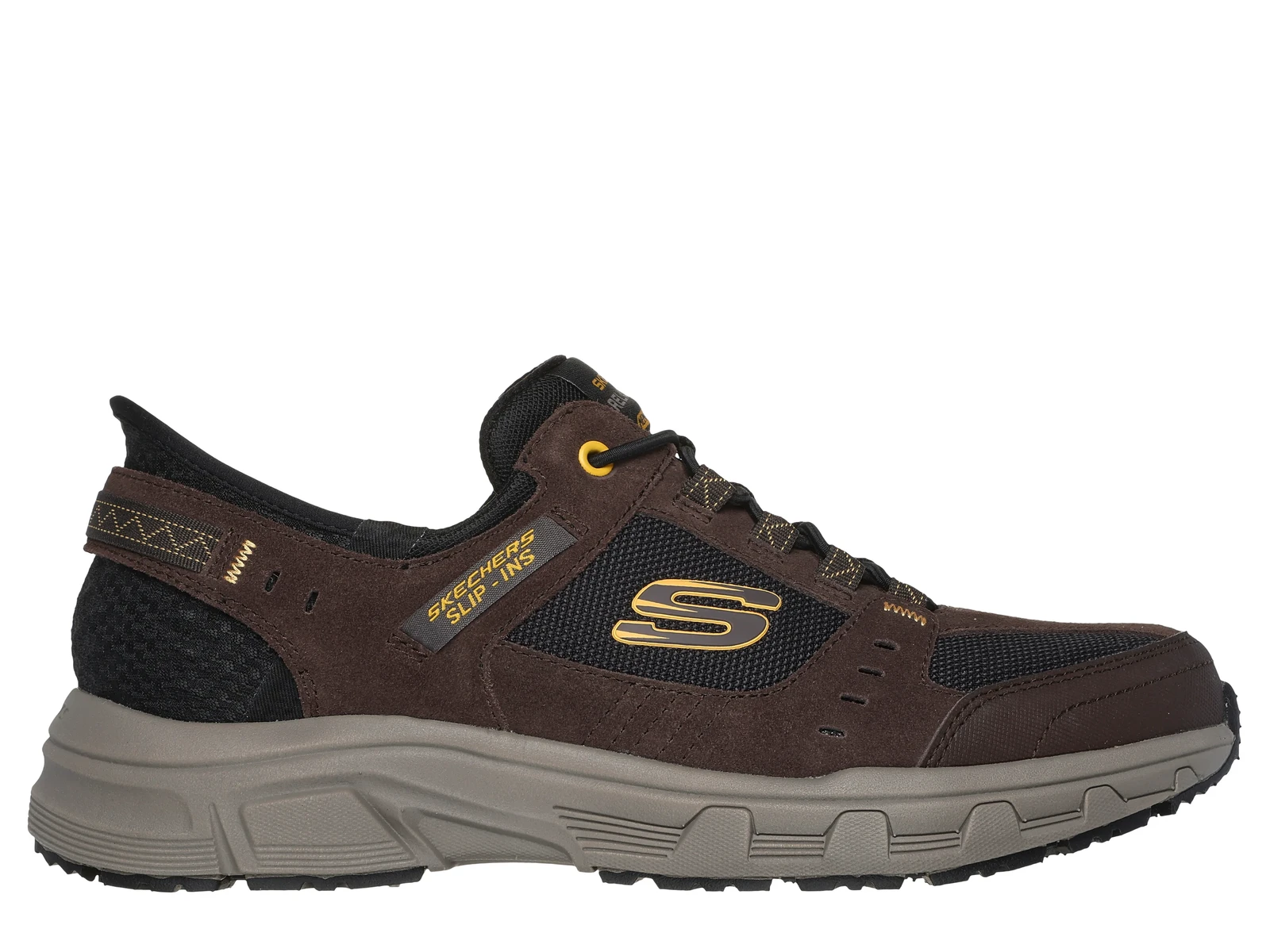 Walk the trails in easy-wearing comfort with Skechers Hands Free Slip-ins® Relaxed Fit®: Oak Canyon - Consistent Winner. Designed with out Heel Pillow®, this slip-on outdoor trail design features a suede, synthetic, and mesh upper with a stretch-laced front and a Skechers Air-Cooled Memory Foam® insole.