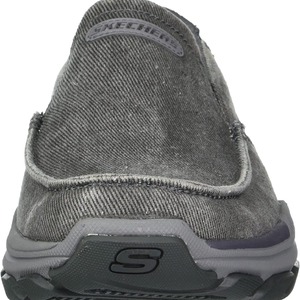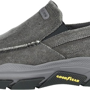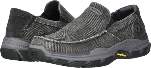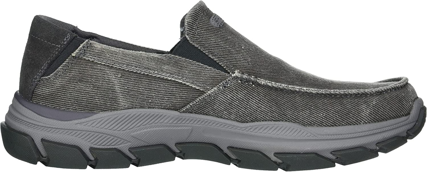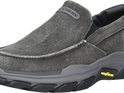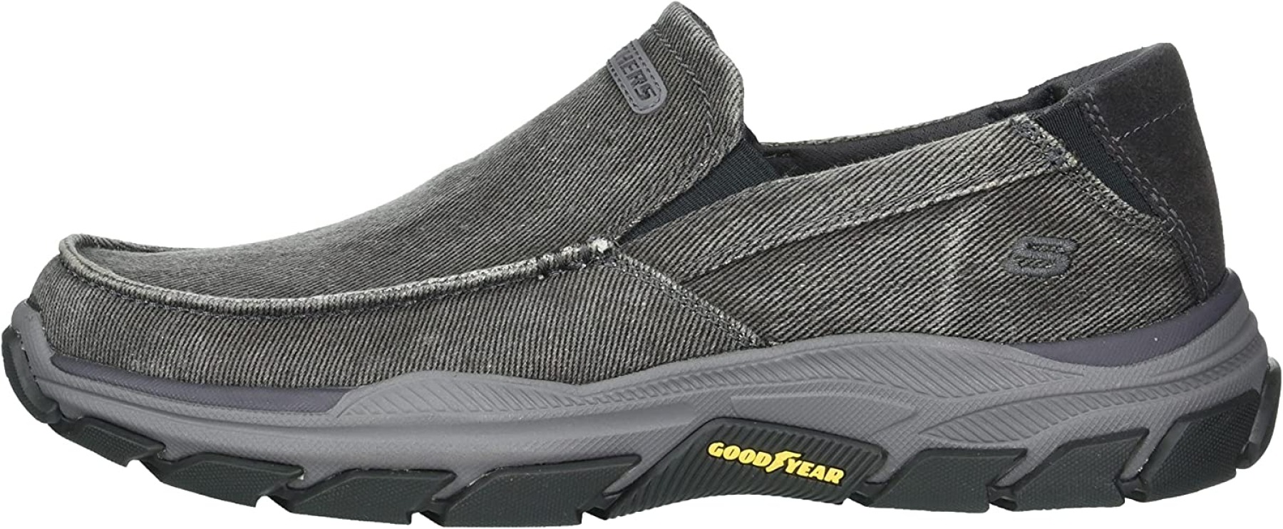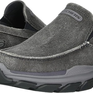 Add comfort and versatile style easily with Skechers Relaxed Fit®: Respected - Melbert. This slip-on casual moc toe loafer features a canvas and soft suede upper with a Skechers Air-Cooled Memory Foam® insole and durable Goodyear® Performance Outsole.